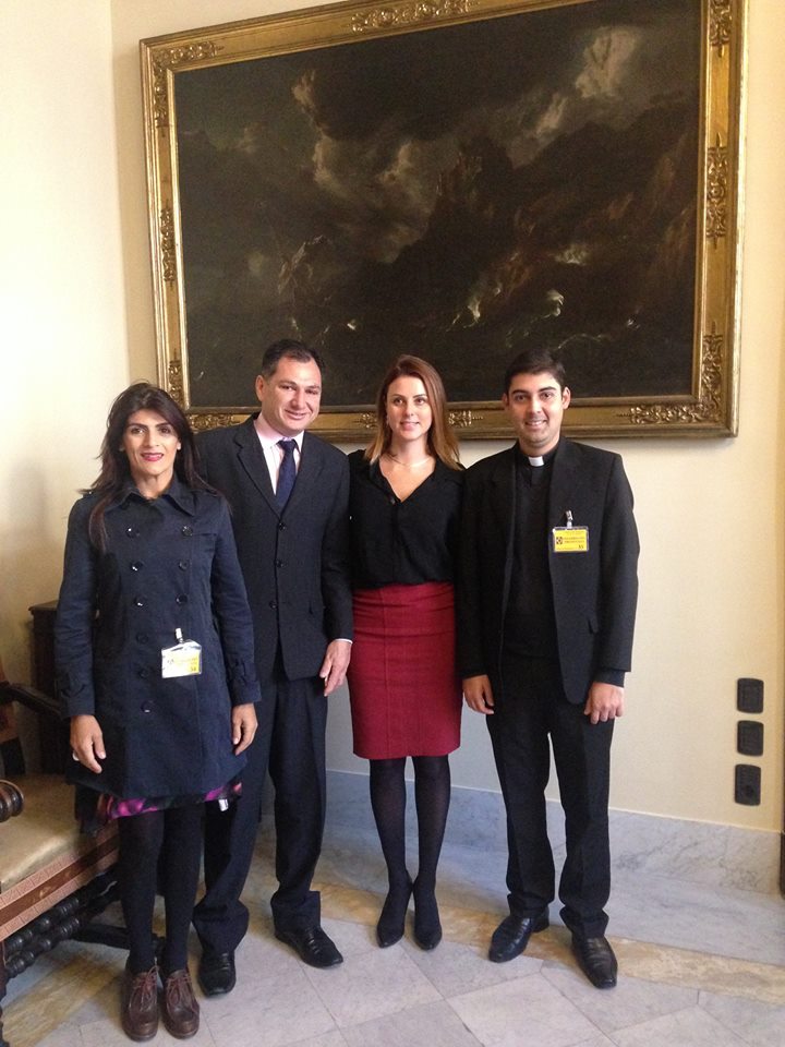 A Deputada Renata Bueno recebeu no dia 16.12.2015 o Prefeito de Mamborê-PR, CLaudinei Calori de Souza que, de passagem por Roma, foi fazer uma visita a ela no Palácio Montecitório, juntamente com sua esposa, Vania Maria Rodrigues de Souza e o sobrinho e padre, Alfredo Rafael Belinato Barreto. Na ocasião, o Prefeito Calori, presenteou a Deputada com uma revista comemorativa da história de Mamborê-PR.