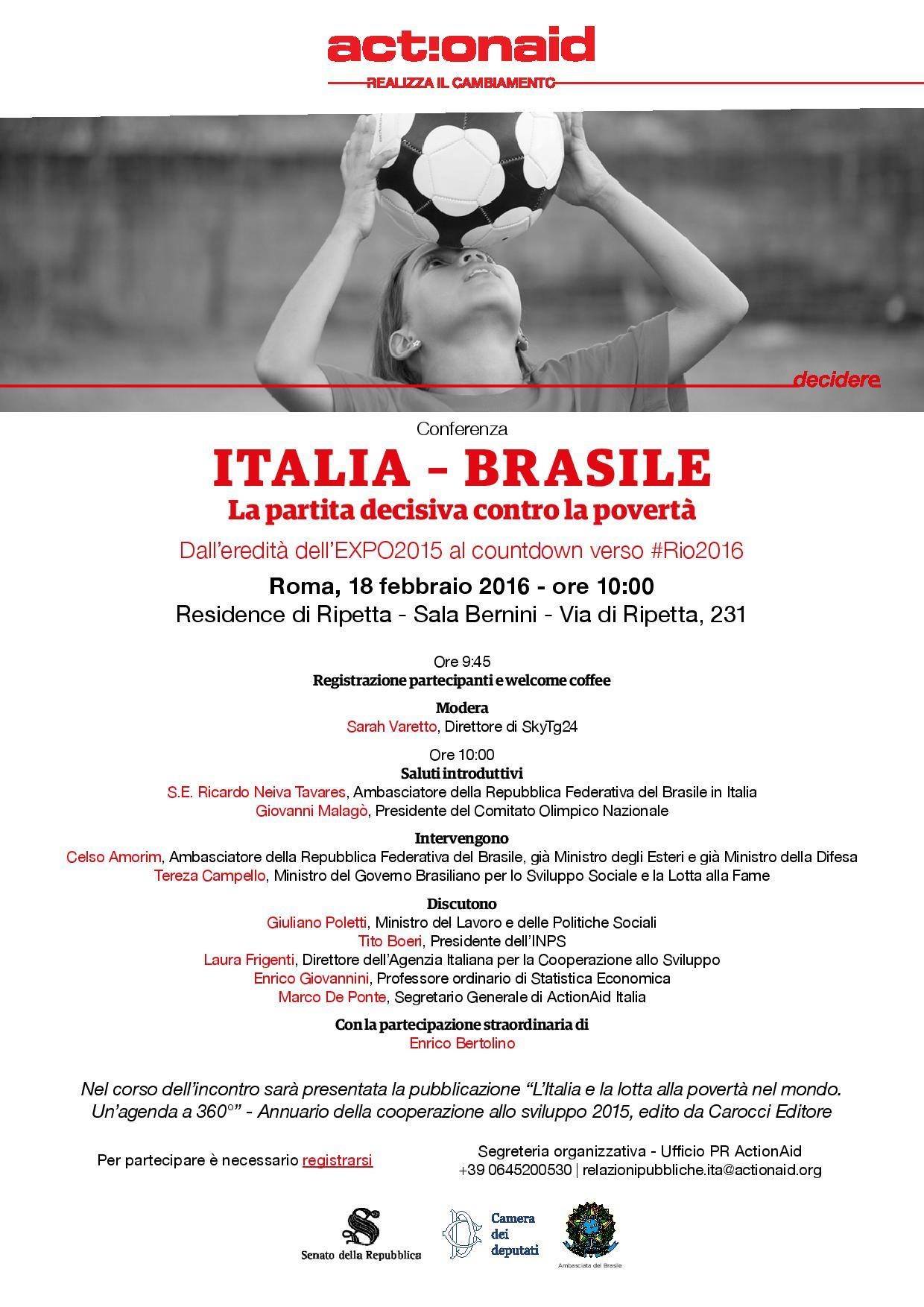 ITALIA – BRASILE, la partita decisiva. Dall’eredità dell’EXPO2015 al countdown verso Rio2016” Questa mattina la parlamentare italo-brasiliana ha partecipato alla Conferenza Stampa organizzata da ActionAid Italia a ridosso della Giornata Mondiale della Giustizia Sociale del 20 febbraio. Dopo i saluti introduttivi di Ricardo Neiva Tavares, Ambasciatore della Repubblica federativa del Brasile in Italia e di Giovanni Malagò, presidente del Comitato Olimpico nazionale, è intervenuto l’Ambasciatore brasiliano Celso Amorim, già Ministro degli Esteri e Ministro della Difesa. I rapporti tra l’Italia e il Brasile troveranno un nuovo “terreno di gioco”, questa volta grazie alle Olimpiadi e alle Paralimpiadi di Rio 2016, all’insegna dello sport ma, soprattutto, della solidarietà e dell’impegno sociale. Il Presidente Malagò, infatti, ha dichiarato che “le Olimpiadi devono andare più verso quei posti dove c’è bisogno sia di un messaggio (etico, ndr) sia di aspetti economici. In questo senso la scelta del Brasile è una scelta forte, vincente, coraggiosa e in linea con tutto questo”. Il Presidente del Coni ha anche annunciato che il Coni e gli sponsor regaleranno un campo di calcio alla favelas di City of God oltre a un percorso di formazione in termini di alimentazione e sport per i ragazzi di Rocinha. Una iniziativa, questa, che la deputata considera molto importante perchè aiuterà l’inclusione di tanti ragazzi che vivono gravi situazioni di disagio economico e sociale. https://www.actionaid.it/informati/notizie/italia-brasile